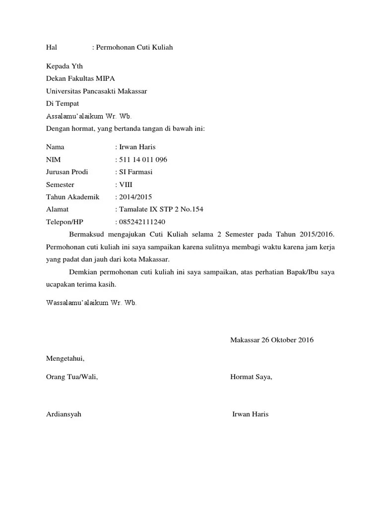 Demikianlah surat permohonan izin cuti akademik ini dibuat. Format dan contoh surat permohonan cuti kuliah perlu diketahui mahasiswa. Apa itu surat permohonan cuti kuliah? Jika seorang mahasiswa ingin mengambil cuti, syaratnya tentu mahasiswa yang bersangkutan harus membuat dan mengajukan contoh surat permohonan cuti kuliah. Surat permohonan penghentian studi sementara.